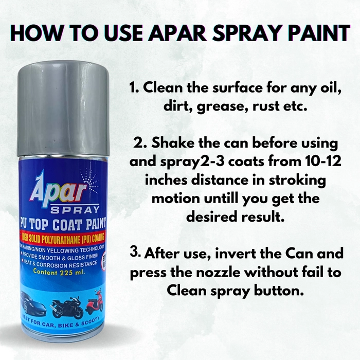 1- Clean the surface area where you want to use thePU Spray Paint for any water, oil, grease, durt, rust etc, If Surface is rusty or non uniform, use 600 No. grit sandpaper to Smooth the Surface. To get better anti-rust performance on metal surface, apply APARSPRAY primer surfacer Spray Paint as a base coat.